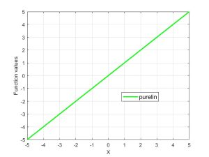 Figure 4. Activation function of the neuron: (а) Logistic Sigmoid (logsig); (b) Hyperbolic Tangent Sigmoid (tansig); (с) Linear transfer function (purelin)