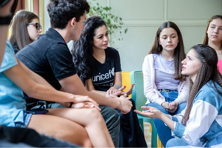 Националният посланик на УНИЦЕФ в България актрисата Елена Петрова, която подкрепя програмата „Стъпки заедно“, разговаря с ученици за справянето с тормоза и насилието в училище