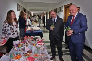 Четвъртият и петият етаж в МОН едва успяваха да съберат масите с ръчно изработени изделия и продукти. Те се продават от деца и ученици от съответната детска градина или училище, като всяка образователна институция избира за какво да използва събраната от продажби сума.