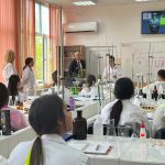 Ева-Мария Дръндарова, носител на награда в националния конкурс „Празник на химията“, демонстрира в лабораторията определяне на общата киселинност на мед.