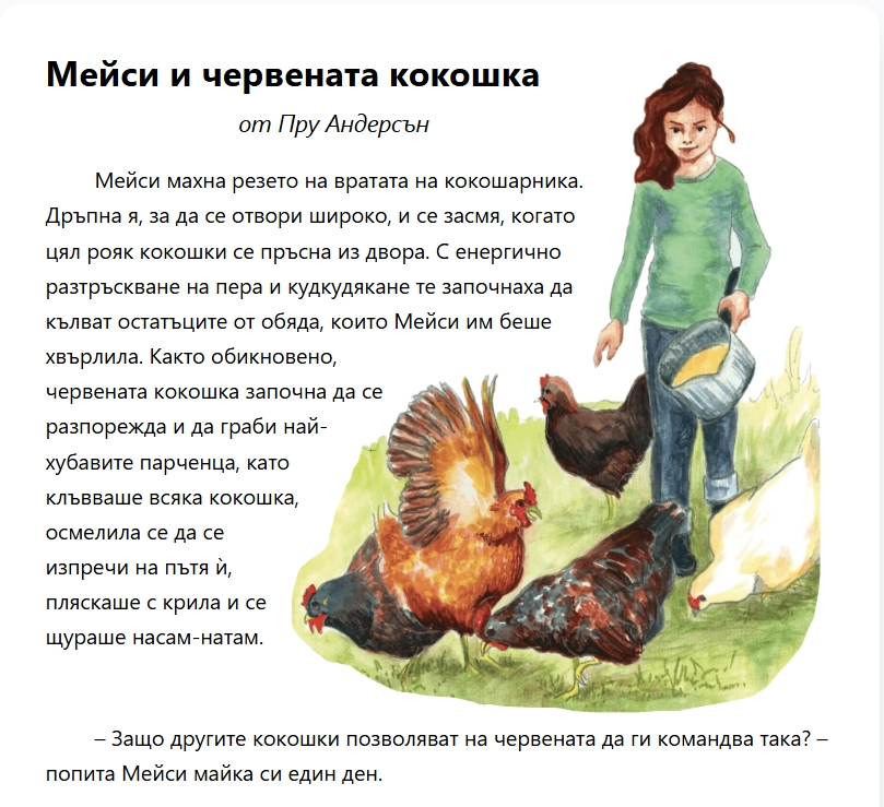 В първото учениците трябва да прочетат текста за Мейси и нейната специална червена кокошка и да отговорят на 16 отворени и затворени въпроса. Второто упражнение е озаглавено „Загадката на гигантския дъб“ и децата трябва да разкрият неговата тайна и да проверят какво са научили. В него са включени 14 въпроса.