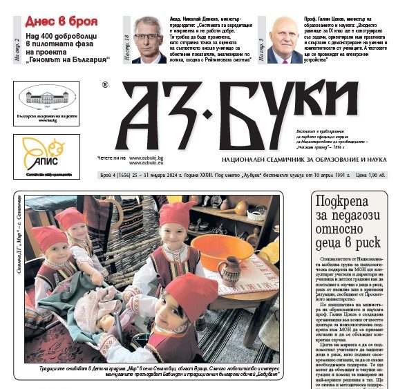 <h3 class="col mt-0 mb-2"><img class="size-medium wp-image-115097 alignleft" src="https://azbuki.bg/wp-content/uploads/2024/02/az-buki-4-2024-213x300.jpg" alt="" width="213" height="300" />В новия брой четете:</h3> - Нов механизъм за университетските заплати - <em>Матурата ще може да се повтаря за по-висока оценка, реши на първо четене Народното събрание</em> - Разчитат българския геном - <em>Над 400 доброволци се включват в пилотната фаза на мащабния проект</em> - Входното за IX клас – на компютри - <em>Задачите за НВО в края на X клас ще бъдат по-практически ориентирани</em> - 110 консултанти - помагат в избора на професия - Как деца решават конфликти - <em>В 23. ДГ „Иглика“ във Варна обичат предизвикателствата и новостите и ги „канят“ всеки ден в час</em> - Героите на бате Емо - <em>Усмивките на децата не се купуват с пари, казва треньорът по самбо, който подкрепя деца със специални потребности</em> <a class="fp-embed" style="max-width: 100%;" href="https://73fc06f9.flowpaper.com/42024/#PreviewMode=Miniature" data-fp-width="700px" data-fp-height="400px">Вестник „Аз-буки“ – брой 4/2024 г.</a><script async defer src="https://cdn-online.flowpaper.com/zine/3.8.2/js/embed.min.js"></script> <a href="https://azbuki.bg/wp-content/uploads/2024/newspaper/%D0%B2.%20%D0%90%D0%B7-%D0%B1%D1%83%D0%BA%D0%B8%2C%20%D0%B1%D1%80.%204%2C%202024.pdf" target="_blank" rel="noopener">Свалете</a> броя на вашeто устройство.