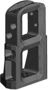 There is no need to simplify the fixture model geometry, as it is not overly complex and the 3D model is used as is for the analysis. Bolted connections to the armature are presented by imprints of bolts to the fixture and thus are not included in the model. Used for simulations geometry model is shown in Figure 3 b).