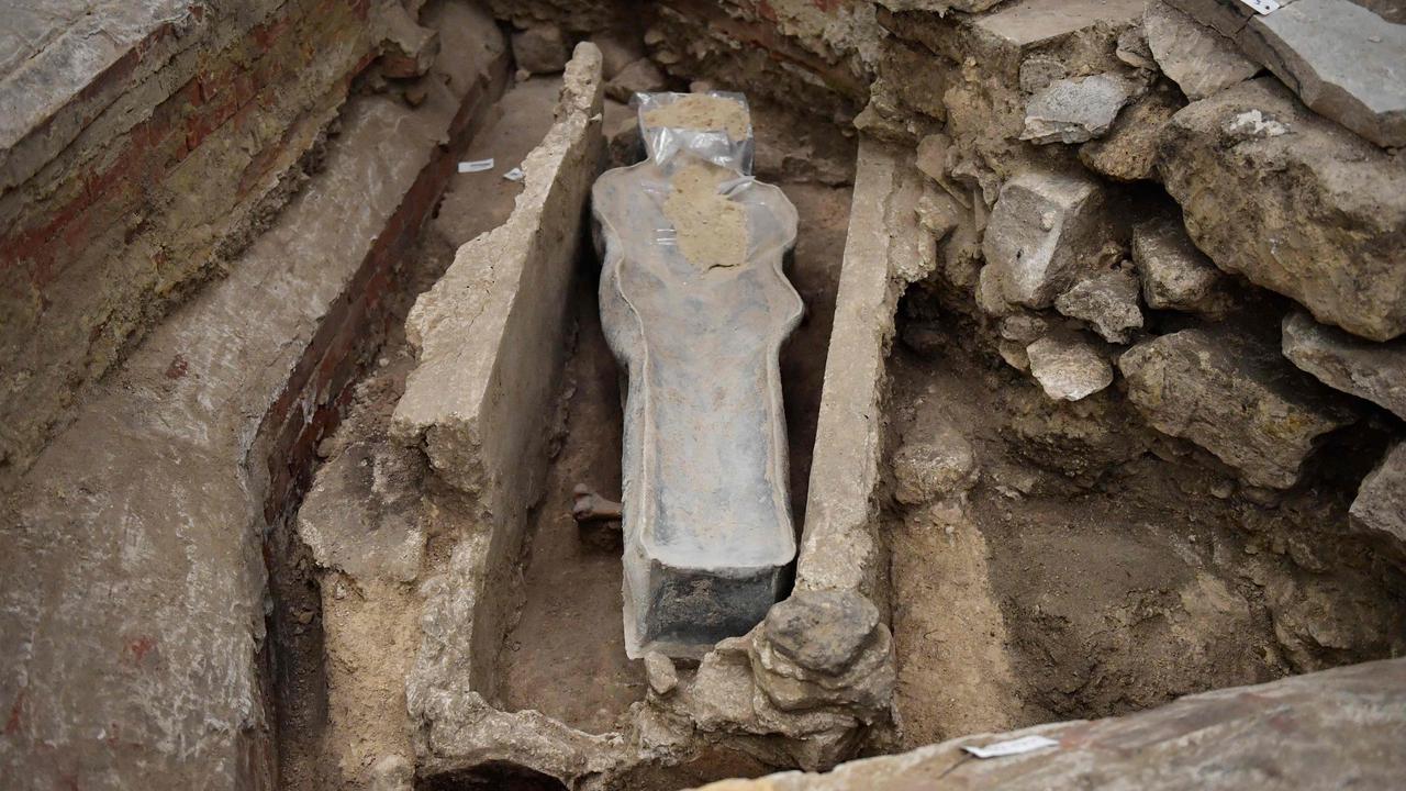 Археолозите казаха, че оловният саркофаг вероятно принадлежи на висш сановник. Те са на мнение, че може да датира от XIV век, което, ако се потвърди, ще направи находката изключителна.