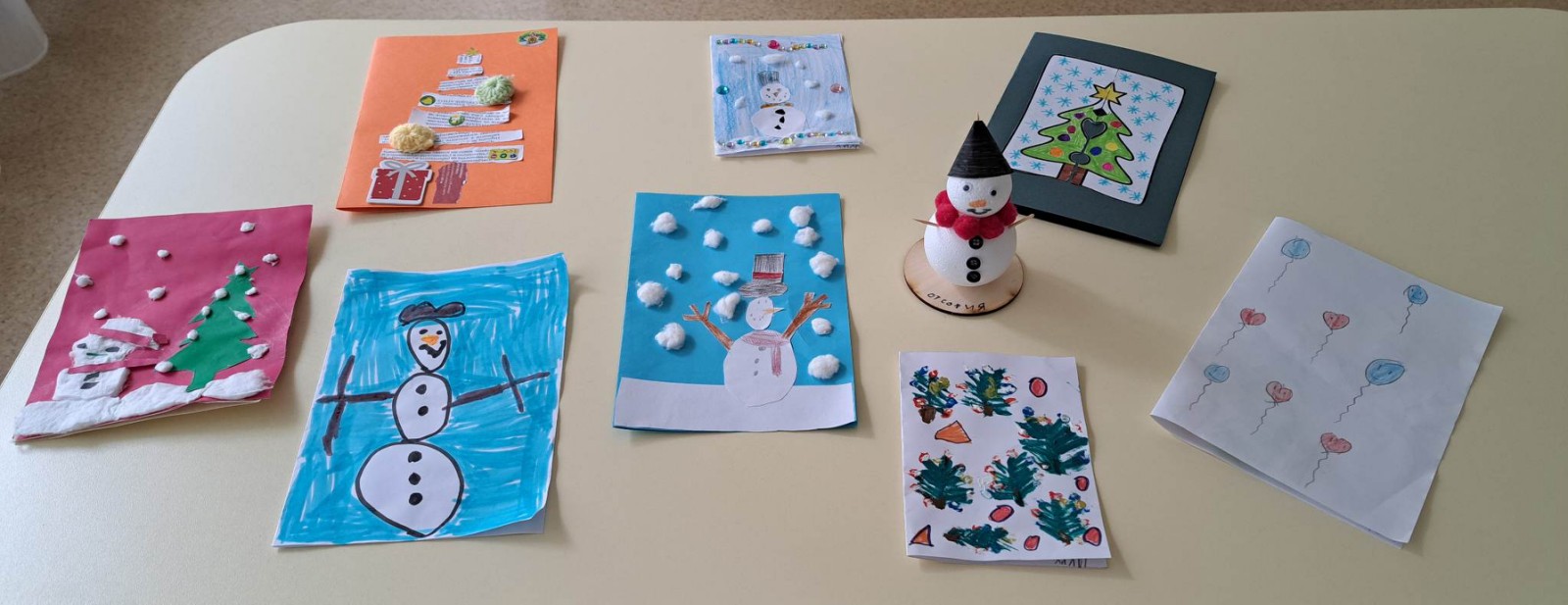 Заедно с учителите в градината и с помощта на родителите си вкъщи децата изработват картички със снежни човеци и елхички, които да създадат коледно настроение на болните и да им пожелаят да се оправят бързо.