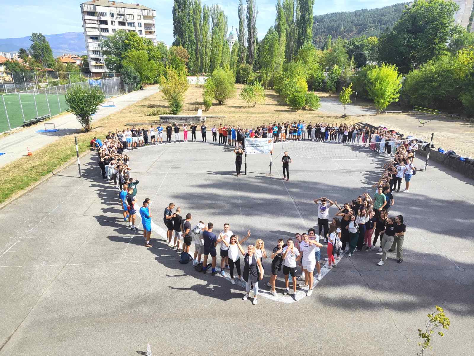 За финал всички заедно се хванаха за ръце и изобразиха огромно сърце в двора на училището.
