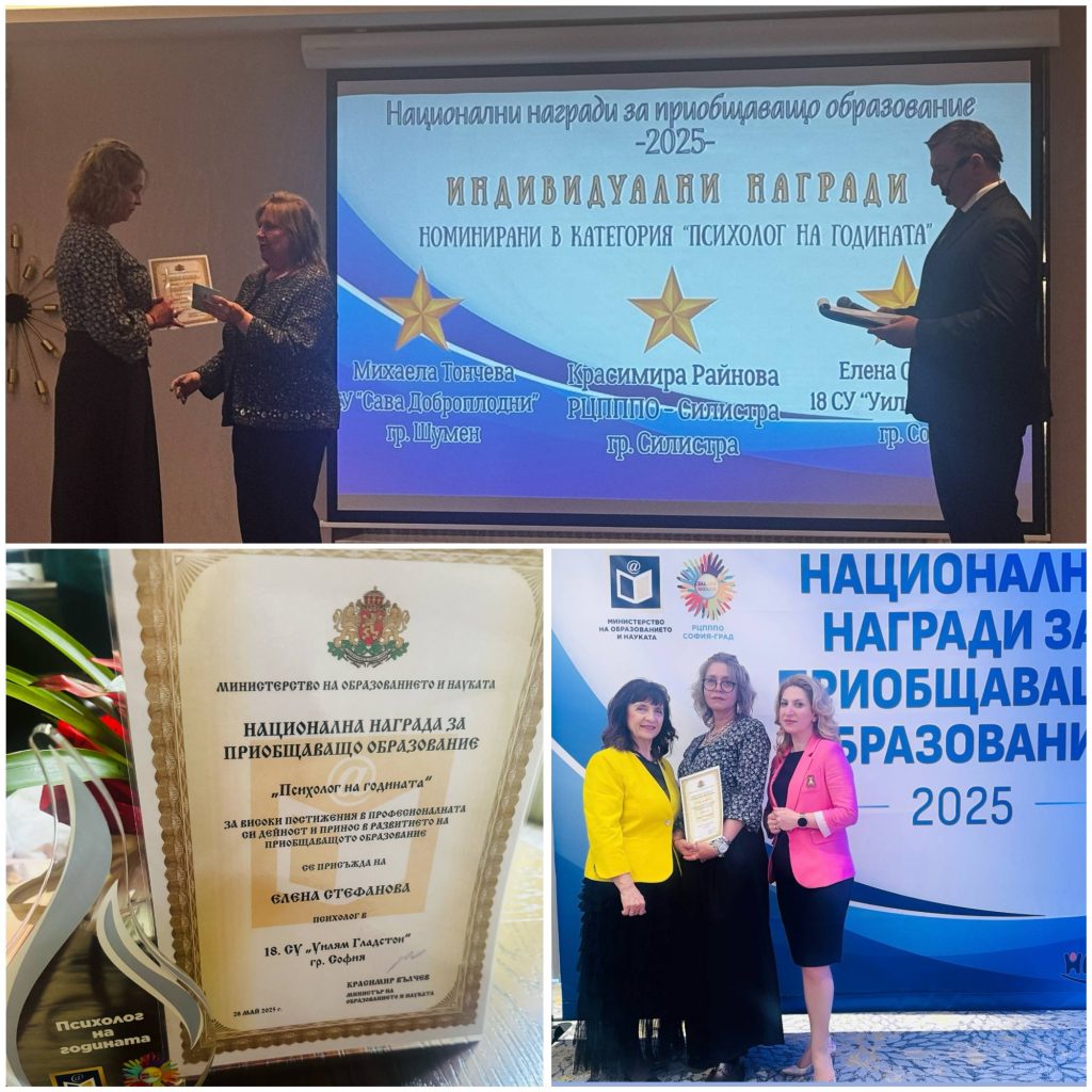 Срещаме се с Елена Стефанова от столичното 18. СУ „Уилям Гладстон“. Тя получи най-високото отличие в категория „Психолог“.