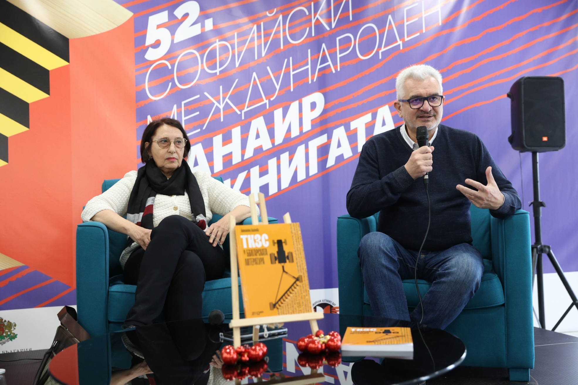 Проф. Антоанета Алипиева и Емил Спахийски – директор на Национално издателство за образование и наука „Аз-буки“, при представянето на изследването „ТКЗС в българската литература“ в рамките на 52. софийски международен панаир на книгата в Националния дворец на културата