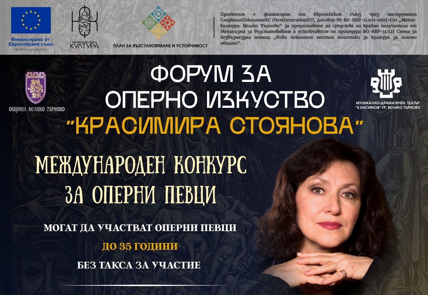 Амбициозният конкурс се реализира с подкрепата на европейски средства. Директорът на Форума Васил Вълчев споделя, че събитието е естествено продължение и надграждане на майсторските класове, които Красимира Стоянова провежда във Велико Търново и които завършват с гала-концерт на лауреатите заедно с оркестъра на великотърновския театър.