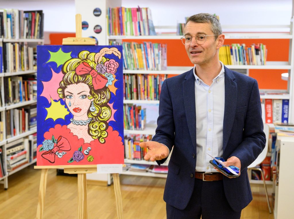 Матиас Фавро – аташе по образователното сътрудничество към френското посолство у нас, открива изложбата „Поглед към Франция“ на възпитаници на 9. Френска гимназия във Френския институт в София Снимка АПФБ