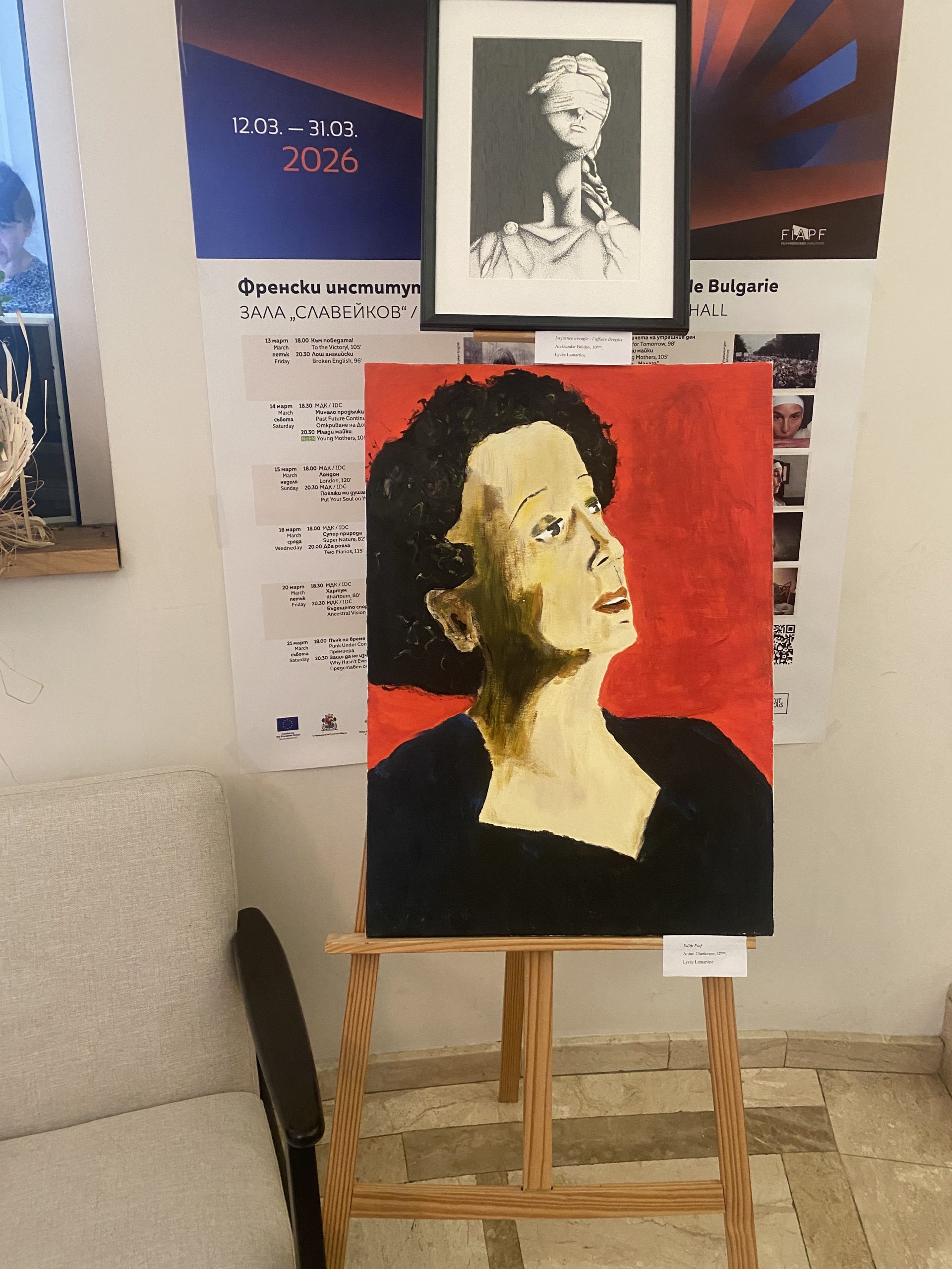 Френският институт се оказва оживен вътре, където родители водят децата си на езикови курсове, провеждат се изпити по френски, а междувременно вървят и прожекции на избрани филми от програмата на „София Филм Фест 2026“. Срещата с картините се случва почти веднага, защото те са разположени навсякъде – във фоайето, по стълбите, между етажите, в зала „Славейков“.
