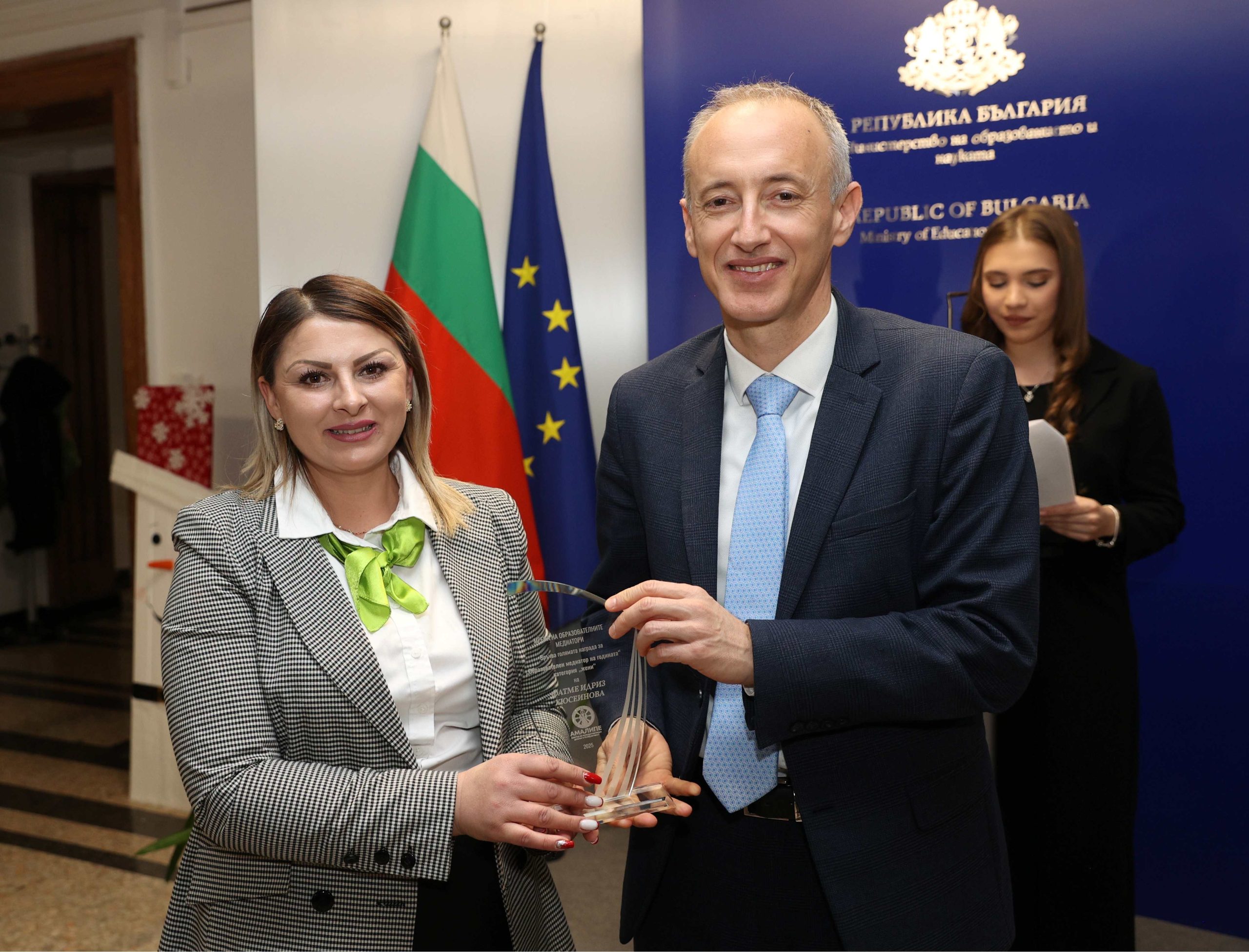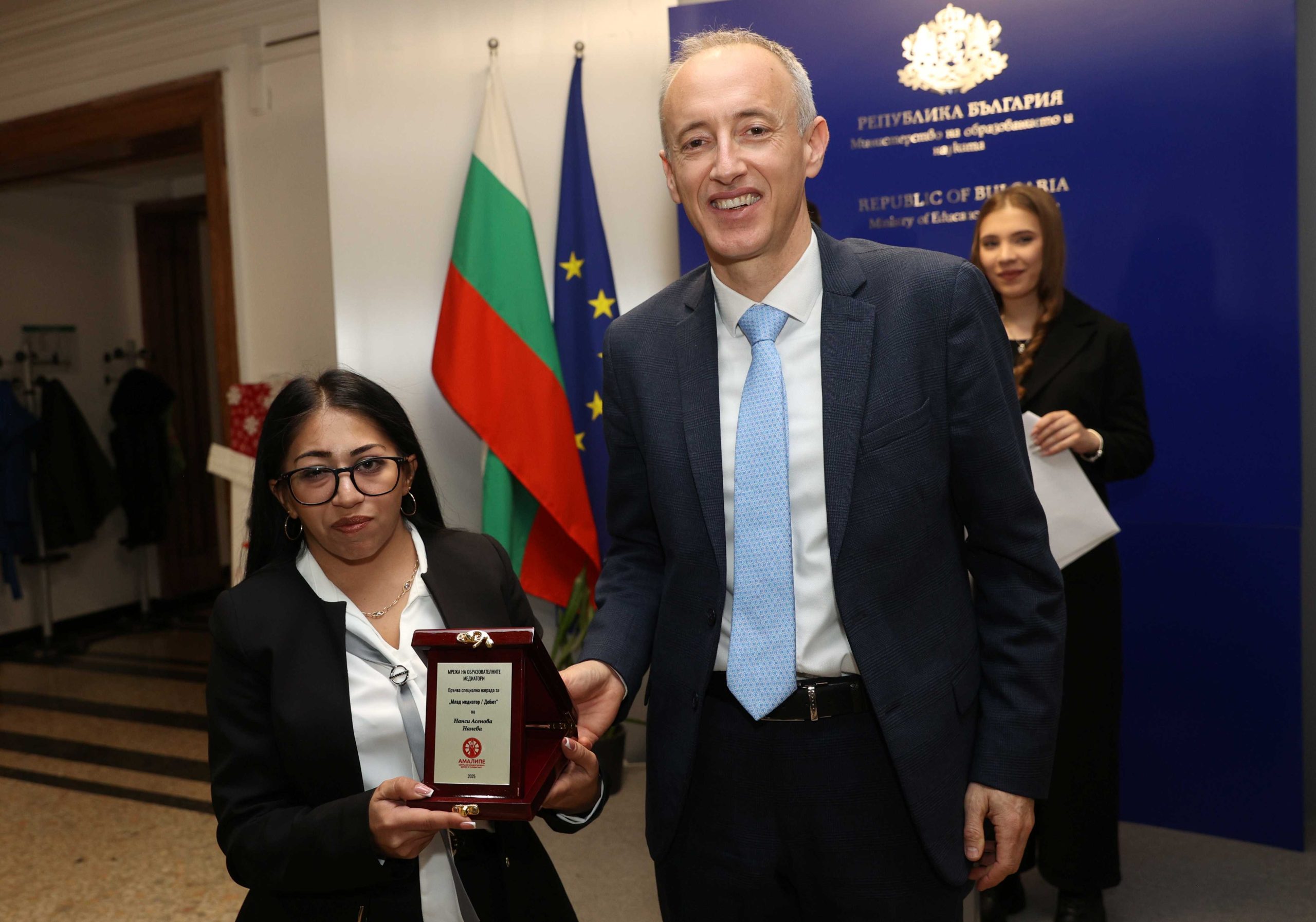 Емилия Енчева от СУ „Йордан Йовков“ в Тутракан получи наградата в категорията „За принос, иновации, устойчивост в ромска общност“, а Нанси Нанева от НУ „Св. св. Кирил и Методий“ в Тополовград – тази за „Млад медиатор“ за 2025 г.