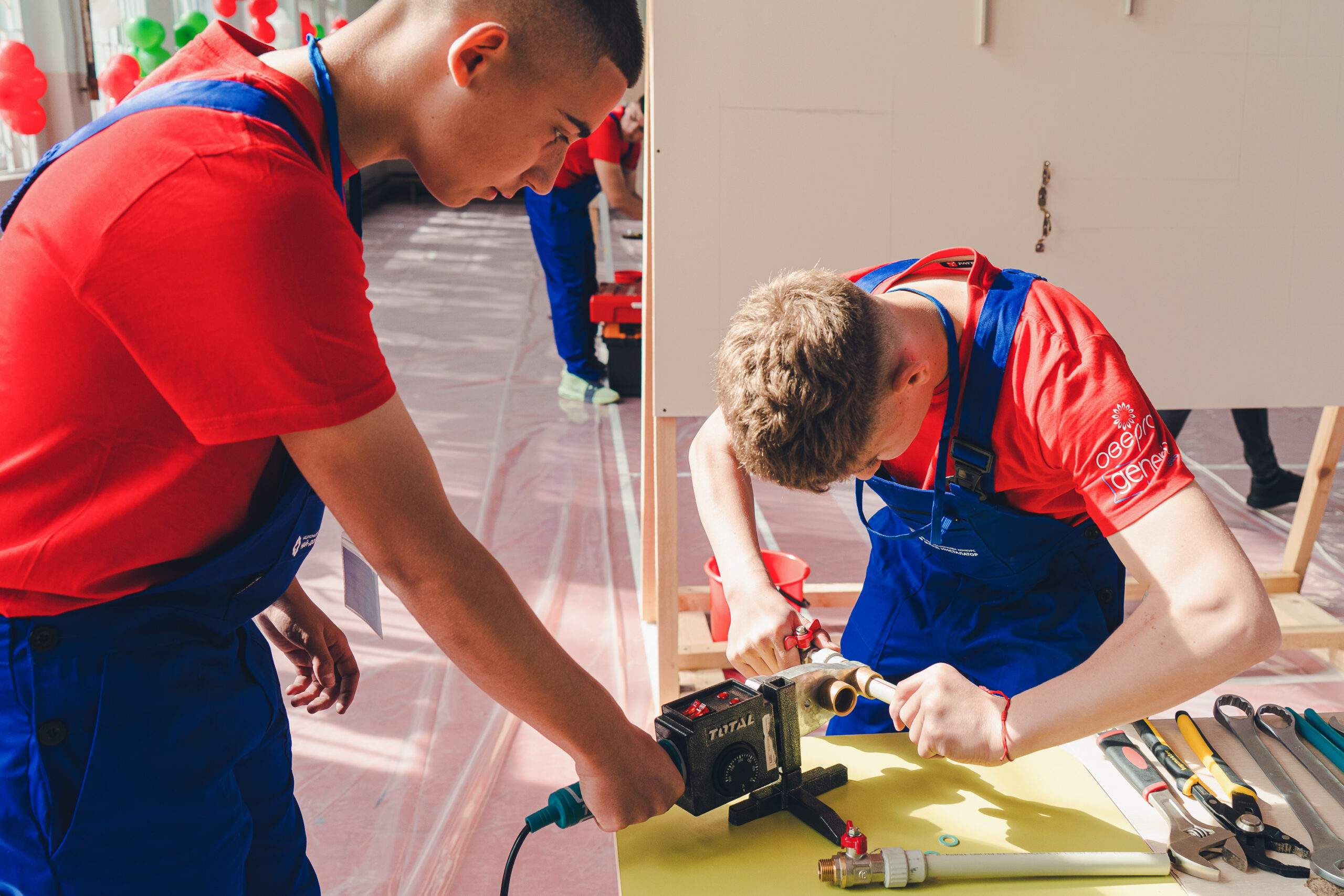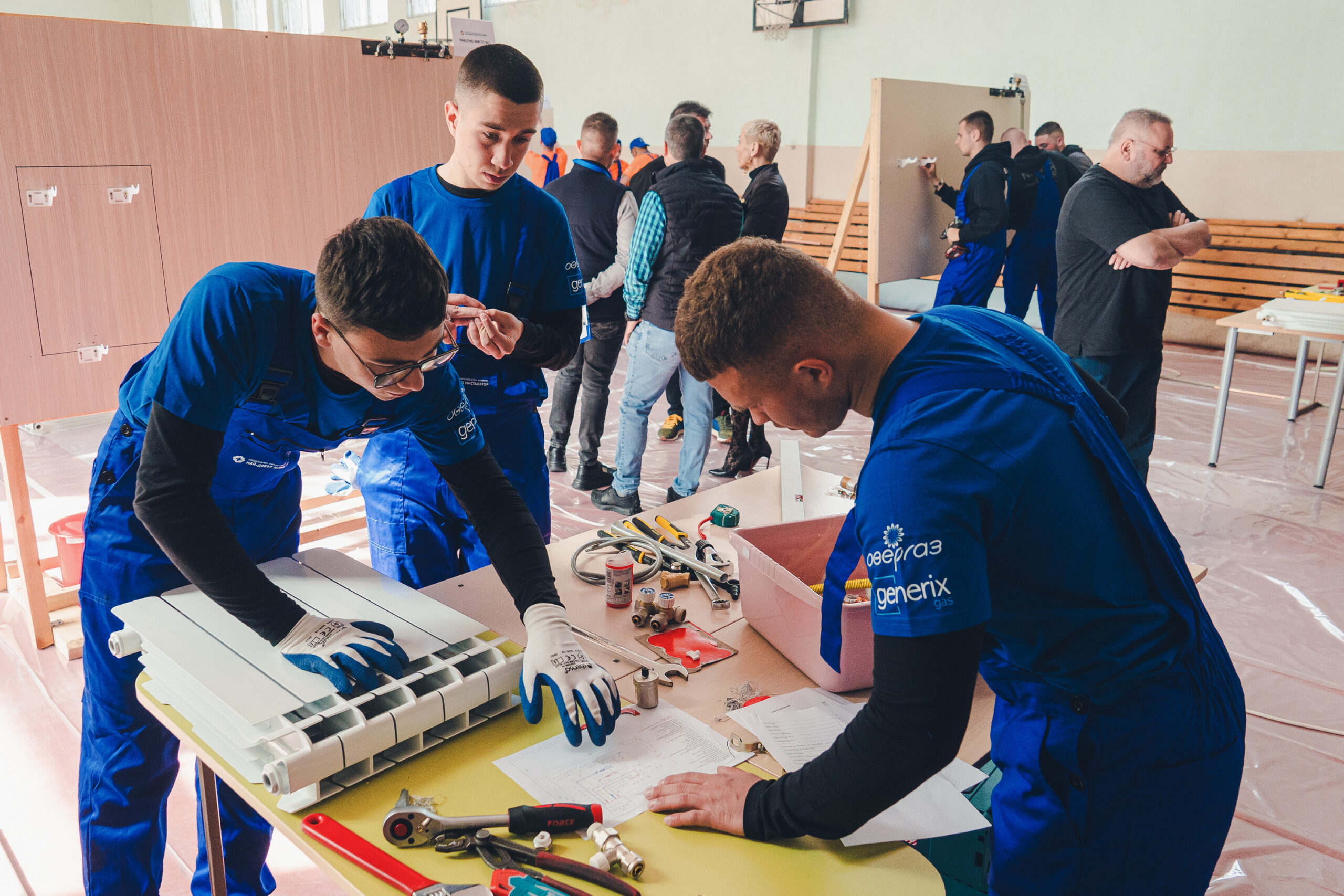 Гимназистите демонстрират знания и практически умения чрез изграждане на елементи от газова, санитарна и отоплителна инсталация, работейки в екипи по трима души.